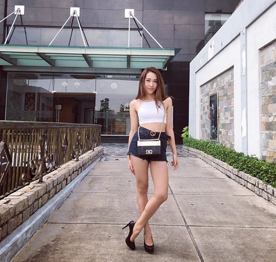 Emily khoe eo thon gọn, chân dài với áo crop top ôm sát và quần short jean.