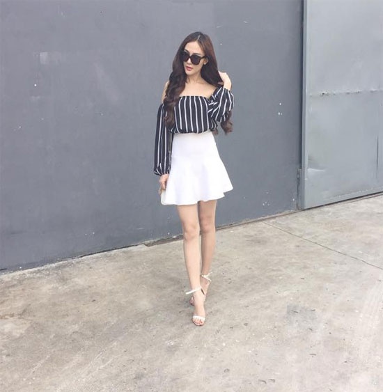 Áo trễ vai gợi cảm thường được Kelly Nguyễn kết hợp cùng chân váy khác nhau như chân váy bút chì hay chân váy chữ A.
