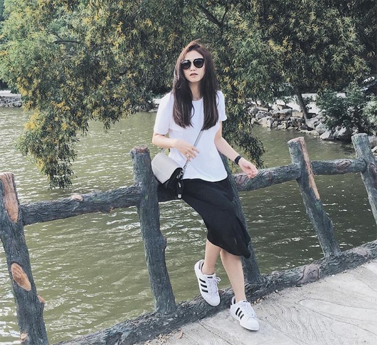Mẫn Tiên thường xuống phố với những item quen thuộc nhưng không kém phần hiện đại là quần short, áo phông, áo cardigan khoác ngoài và giày thể thao.