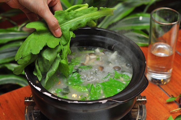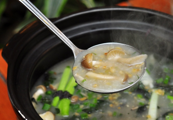 Món nào đi kèm thức nấy thể hiện sự cẩn thận của đầu bếp. 3 món bò là kèm 3 loại tương với mắm nêm khác nhau để món ăn hoàn thiện nhất. Nhưng đã như thói quen ăn nhậu của người Hà Thành bấy lâu, một set ăn hoàn chỉnh không thể thiếu đi món lẩu “chốt hạ”, nhất là trong tiết trời trở lạnh. Lẩu cháo là sự lựa chọn thông minh bởi sau một chặng no nê với thịt thì khách có nhu cầu xì xụp chén cháo ngấm vị ngọt nước xương bò hầm, lẫn cẫn thịt bò băm nhỏ và vui miệng hơn với nấm giòn ngọt. Ngoài ra, niêu lẩu cháo này cũng được chuẩn bị kỹ lưỡng với đủ loại rau, hành, tía tô, gừng.