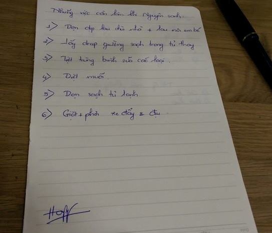 Thư đã liệt kê 6 điều người chồng cần làm trong lúc vợ lâm bồn như dọn dẹp lau chùi nhà, lau nôi em bé, lấy drap giường sạch trong tủ thay, tiệt trùng bình sữa các loại, diệt muỗi, dọn sạch tủ lạnh, giặt phơi xe đẩy và địu. Cuối thư, người vợ không quên để lại chữ ký như "sếp lớn" khiến người xem thích thú.