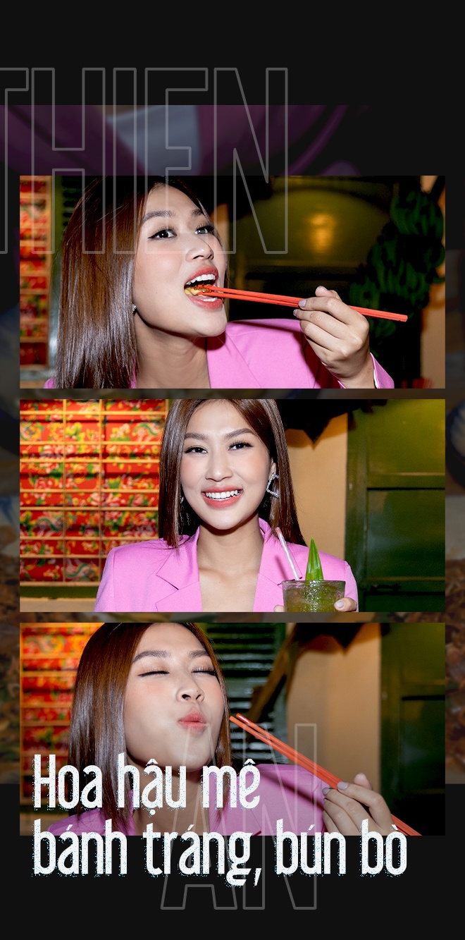 Thiên Ân cũng chợt nhớ về đêm ăn bánh tráng muối tôm với Hoa hậu Hòa bình Indonesia Andina Julie. Cô tiết lộ rằng người bạn cùng phòng khách sạn với mình rất mê mẩn món ăn này. Cả hai đã “xử hết nửa cân bánh tráng chỉ trong một nốt nhạc”.