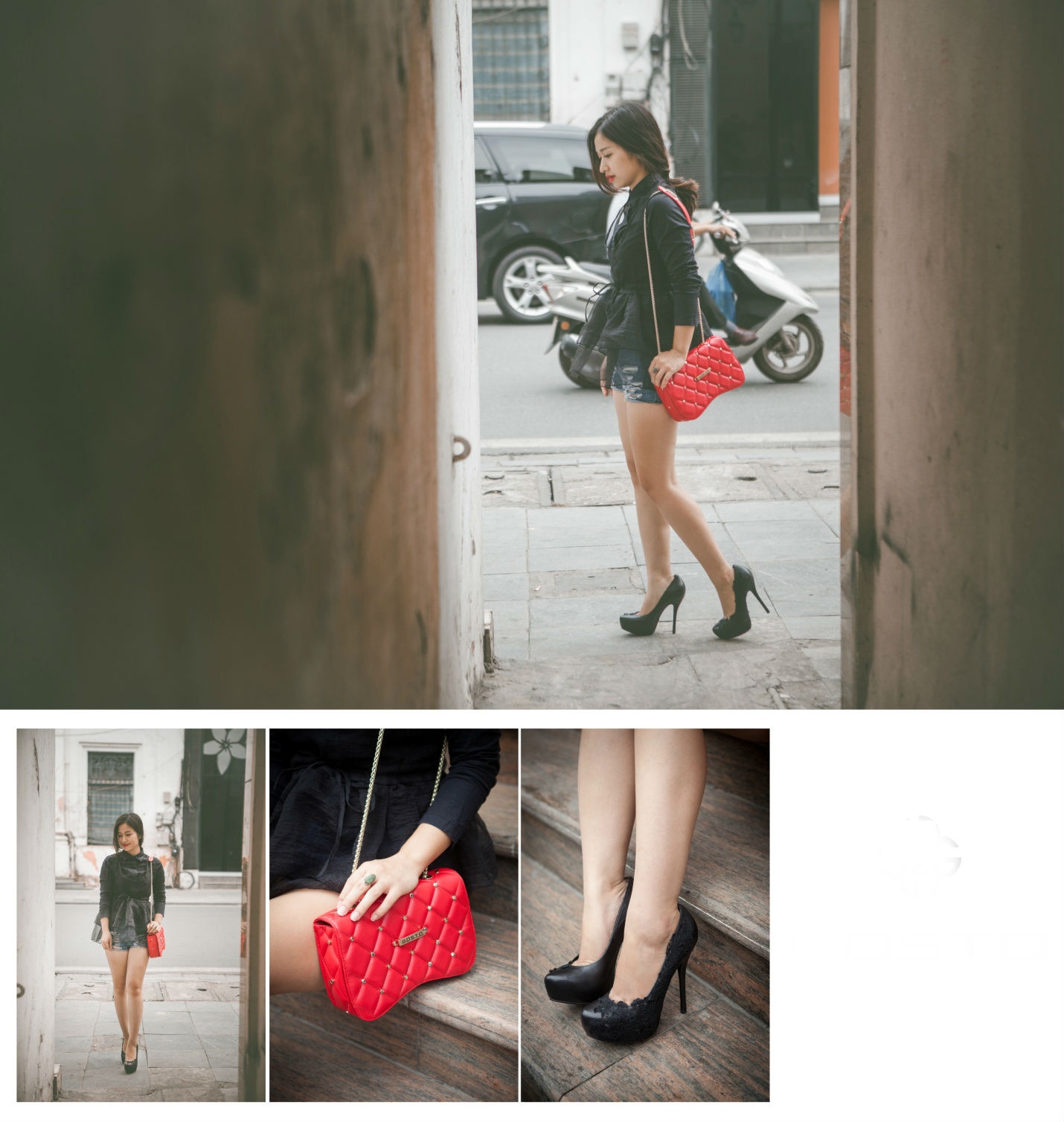 | Gót giày cao, thanh mảnh giúp các cô gái “ăn gian” được chiều cao, họa tiết ren đáp liền vào thân giày cũng giúp trang phục này trở nên sang trọng hơn. Chiếc túi đỏ trở thành điểm hút mắt trong bộ đồ tối màu. |