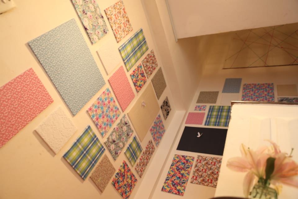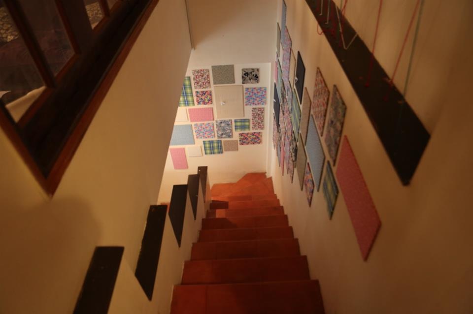Rời không gian tầng trệt, cầu thang với những bức tranh là vải nhiều họa tiết vừa thô mộc vừa tinh tế đưa bạn lên tầng hai.