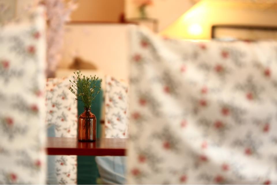 Điểm nổi bật ở La'maison lại là những tấm màn đơn sắc bên khung cửa đầy nắng. Để tránh sự nhàm chán, chủ quán sử dụng thêm hoa tươi và vật dụng handmade nhiều màu sắc.