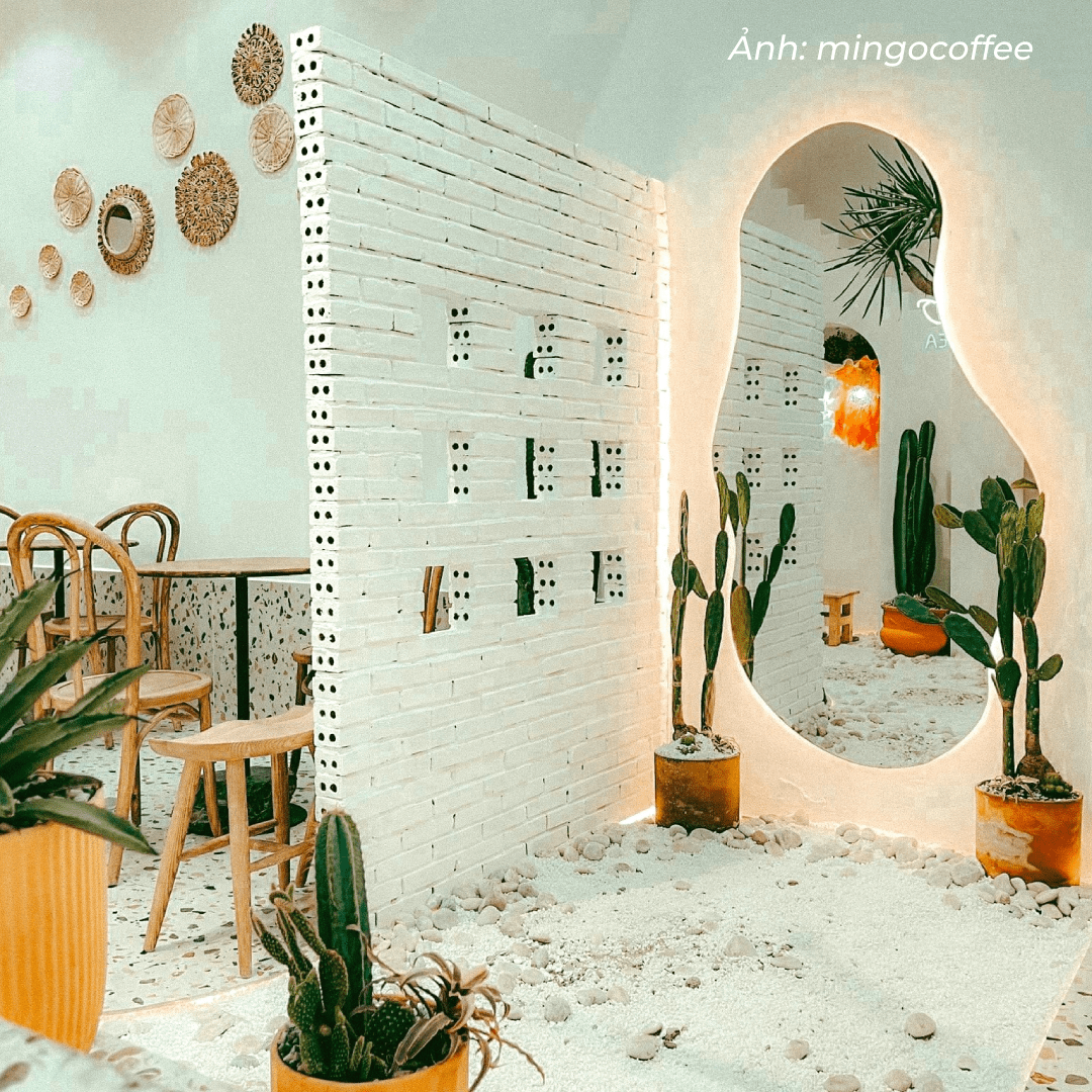 Không gian quán thoảng hương cà phê dịu dàng. Sắc xanh của từng chậu cây, những bản nhạc lofi bay bổng đem lại sự thư giãn, tách biệt xô bồ thị thành. Gam màu trắng chủ đạo của mảng tường giúp mọi thứ tinh tế, tối giản và giàu năng lượng tích cực.
