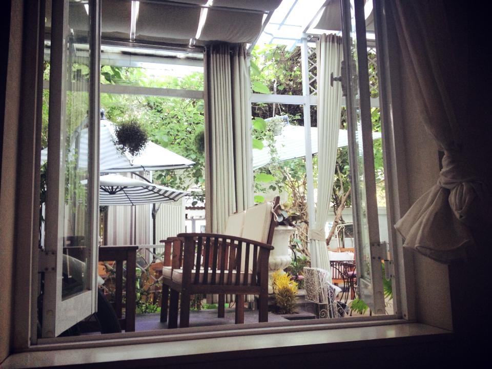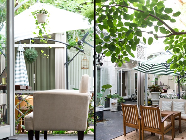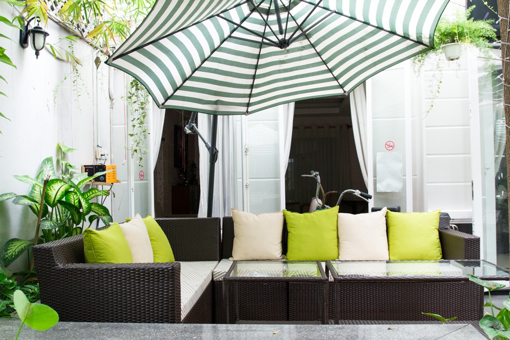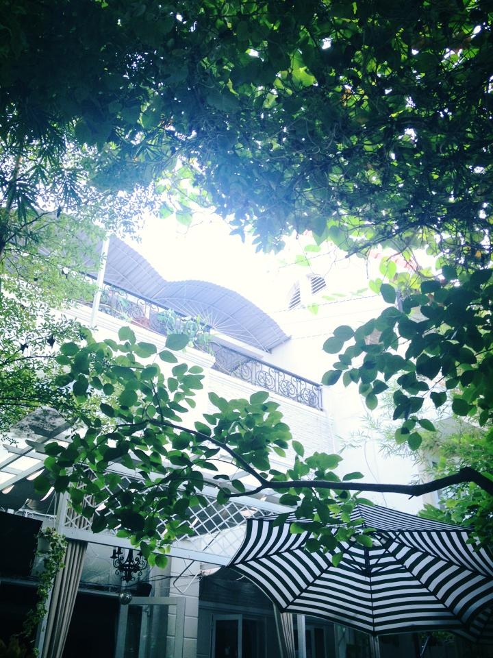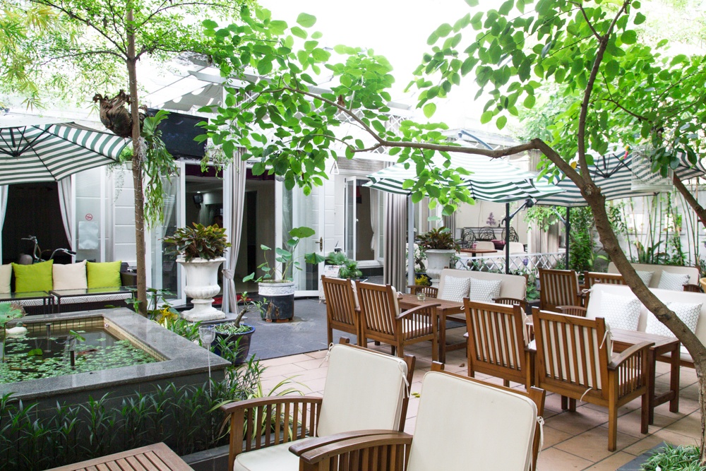 Quán nằm ngay giữa khu vực sầm uất quán xá và tụ điểm giải trí, nhưng lại nép mình trong con hẻm yên tĩnh. Kiến trúc của quán mang phong cách biệt thự phương Tây pha lẫn nét phương Đông. Thiết kế đơn giản nhưng vẫn toát lên nét duyên với khoảng sân mát mẻ, giàn dây leo xanh mượt, hay thoảng chút hương hoa lộc vừng. Đến quán, người ta có thể trút bỏ sự bận rộn, gánh nặng trong cuộc sống để dành cho mình vài phút thảnh thơi, riêng tư, đắm mình trong màu xanh mát.