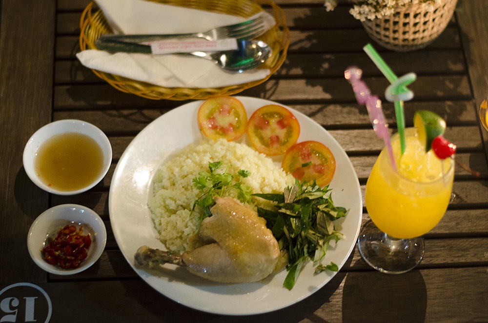 Cơm gà, món đinh của quán, được nấu từ gạo ngon đã được rang lên cùng nước dừa, cho hương vị thơm ngon đặc biệt khi dùng chung với nước mắm gừng pha khéo. Còn gì bằng sau một ngày làm việc mệt nhọc, cùng người thân thưởng thức món cơm gà kèm ly soda Italy hay đá xay Angel mát lạnh?