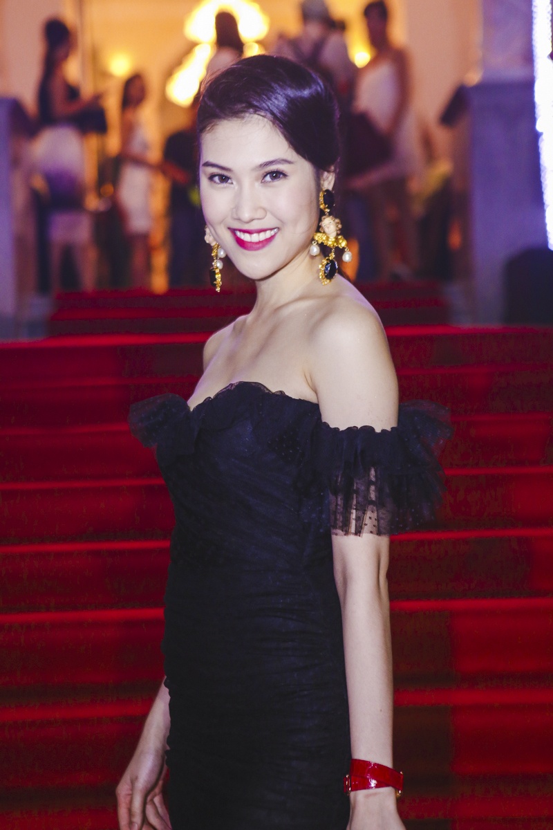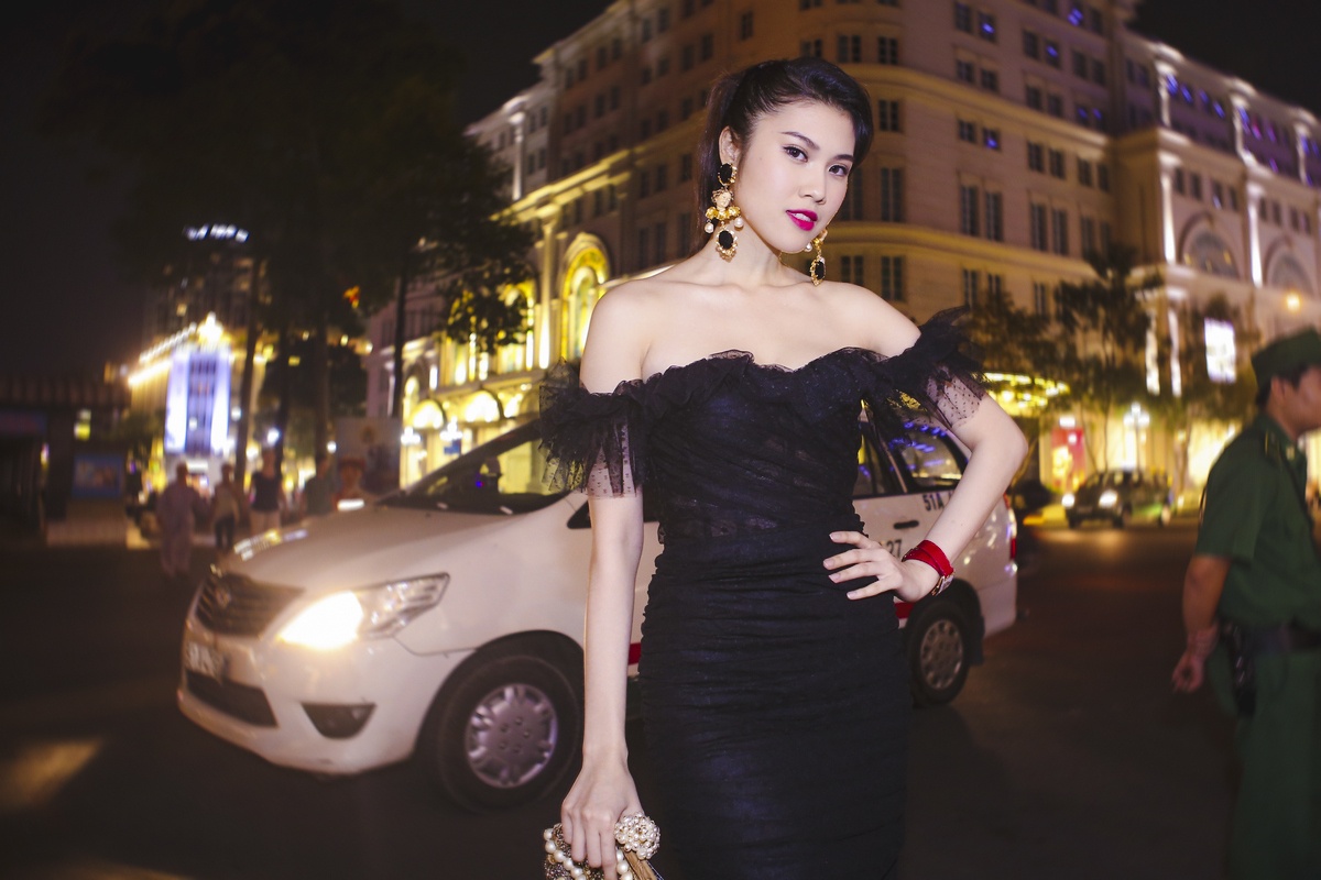 | Kết hợp cùng trang phục đẹp, bạn gái của người mẫu Vĩnh Thụy mix phụ kiện sang trọng đi kèm. Nổi bật hơn cả là chiếc clutch đính hạt ngọc trai tinh tế của thương hiệu Dolce & Gabbana, trị giá hơn 6.000 USD (gần 120 triệu đồng). Trang phục tối màu làm nổi bật phụ kiện ánh đồng. |