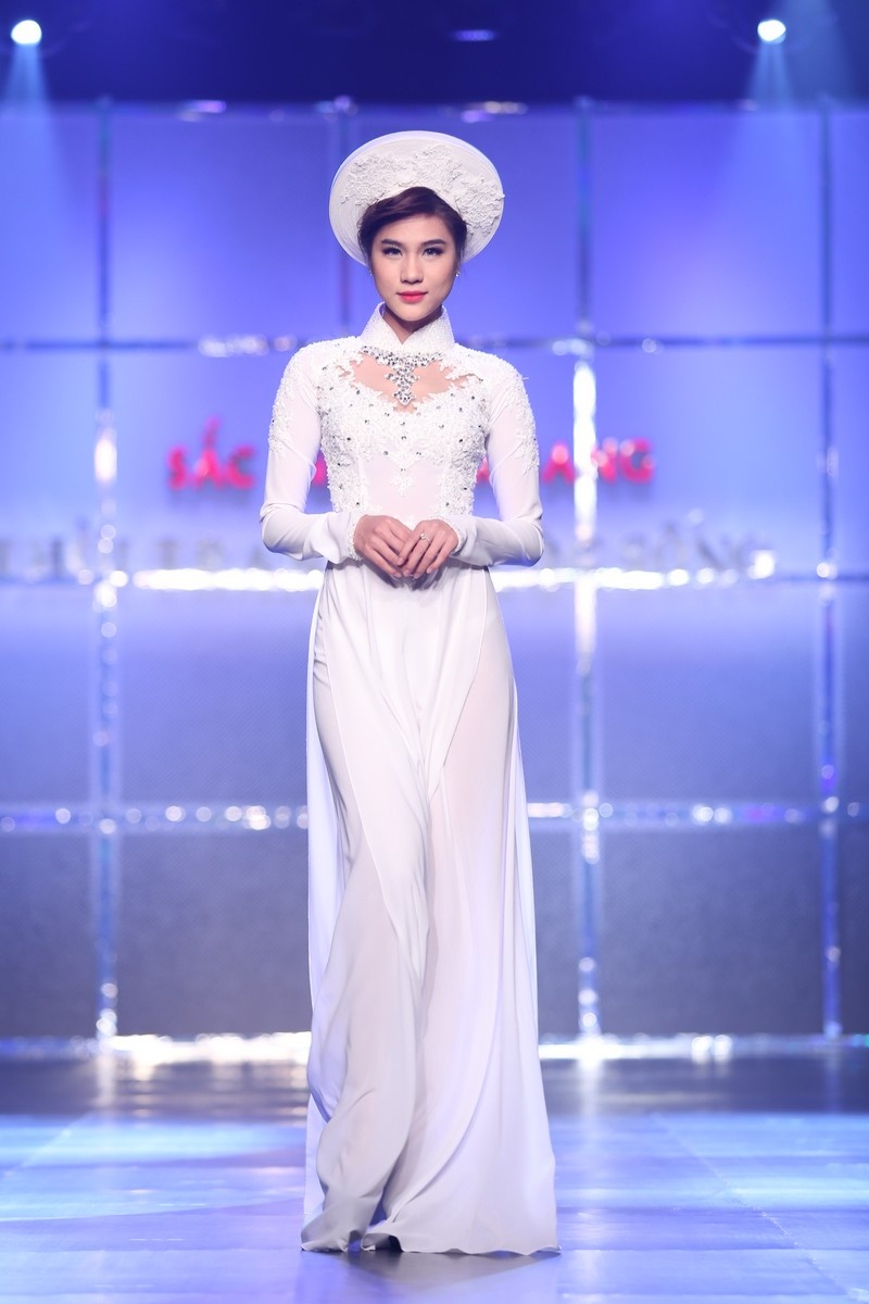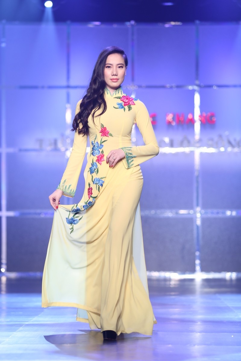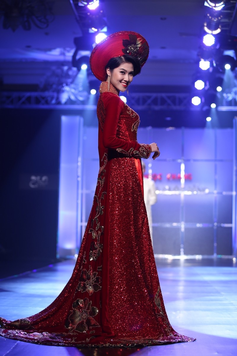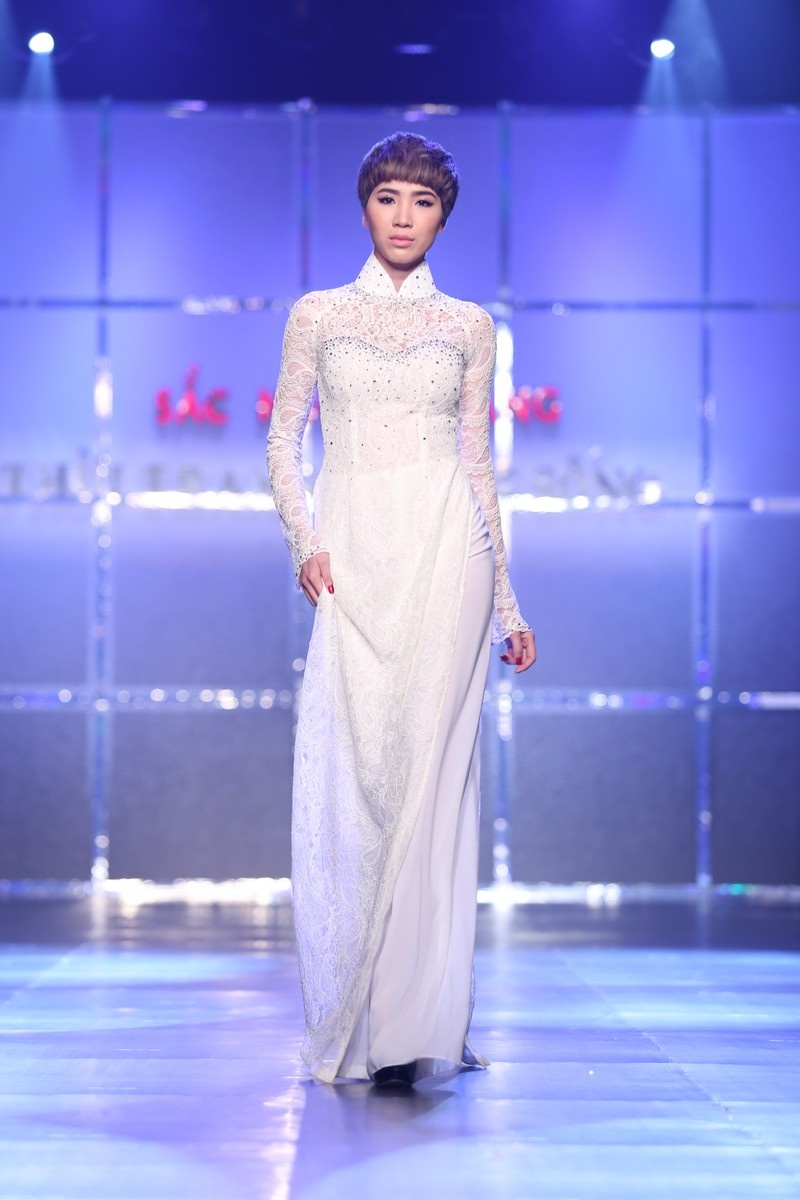 Bạn gái cũ của người mẫu Vĩnh Thụy diện áo dài ánh nhũ lấp lánh cuốn hút người xem khi làm vedette màn diễn BST của Huỳnh Lợi.