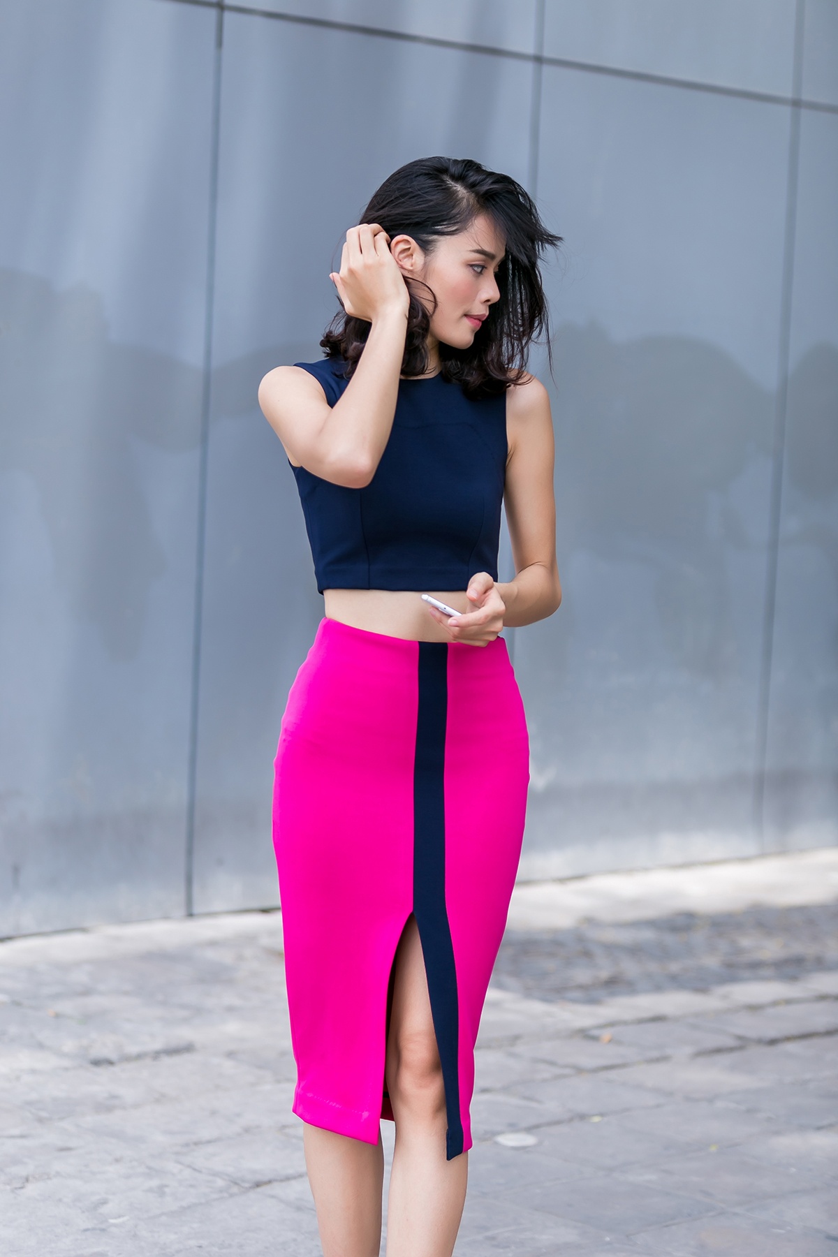 | Vóc dáng gợi cảm của chân dài được phát huy nhờ bộ cánh chất liệu thun co giãn. |