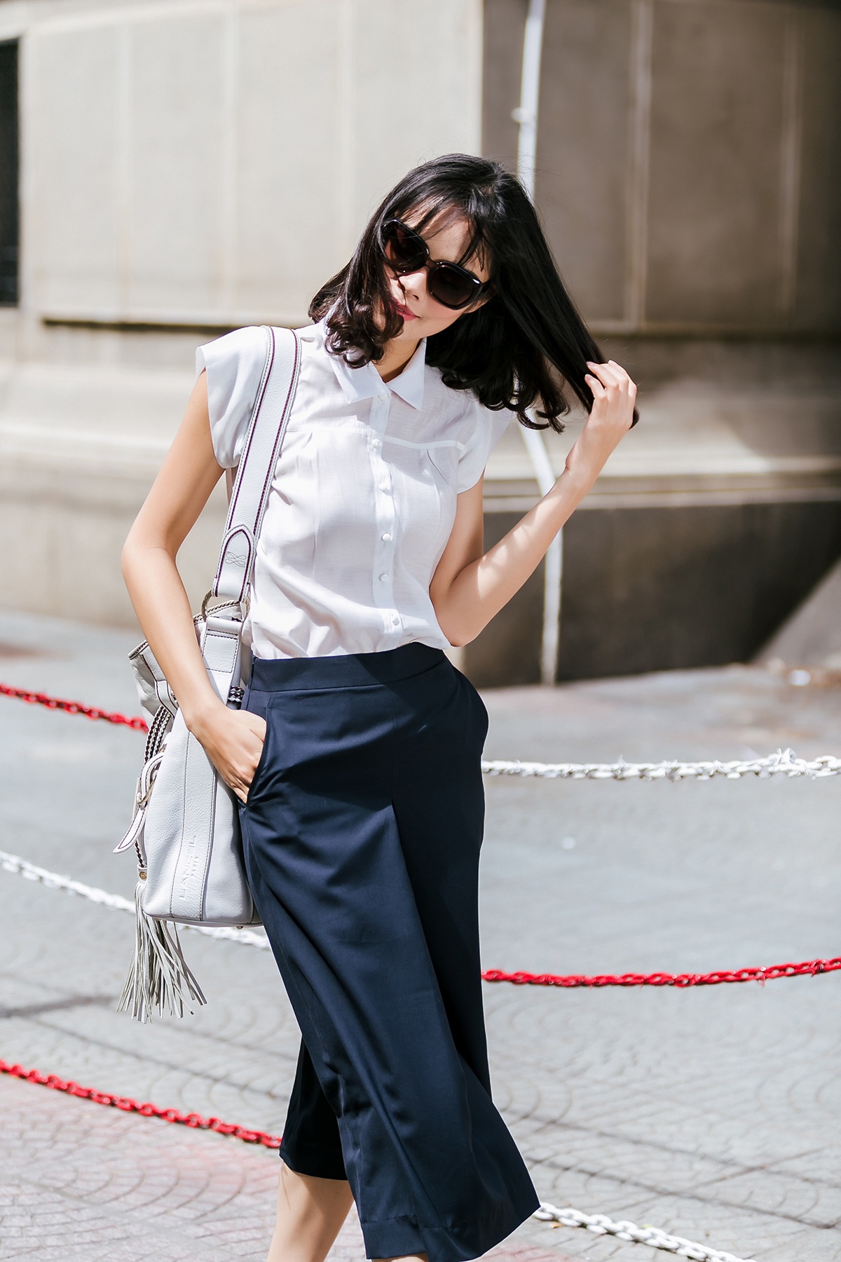 | Phong cách thanh lịch áo sơ-mi cùng quần suông tối màu là chọn lựa an toàn cho các tín đồ sành mốt, Thu Hiền không nằm ngoài xu hướng. |