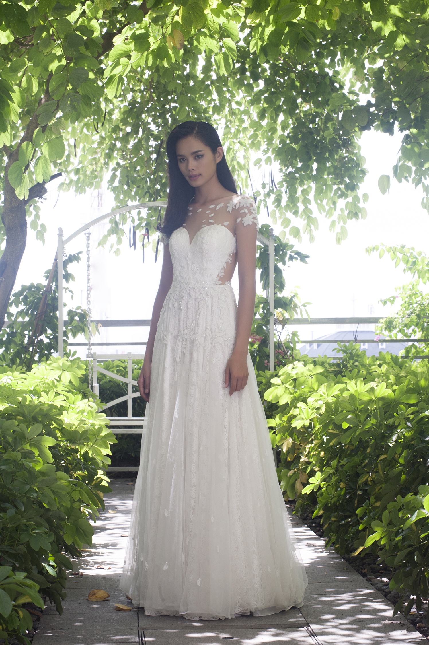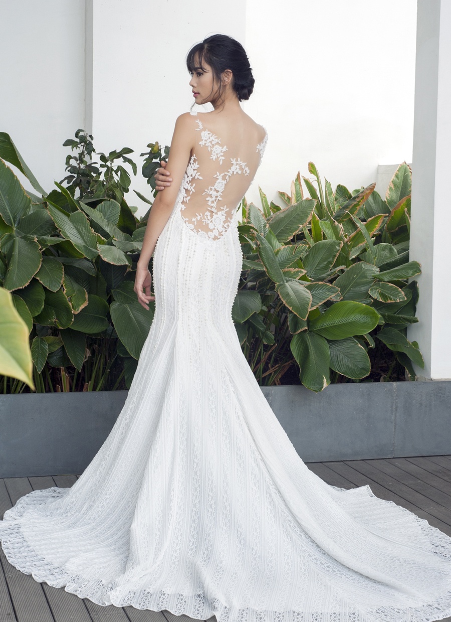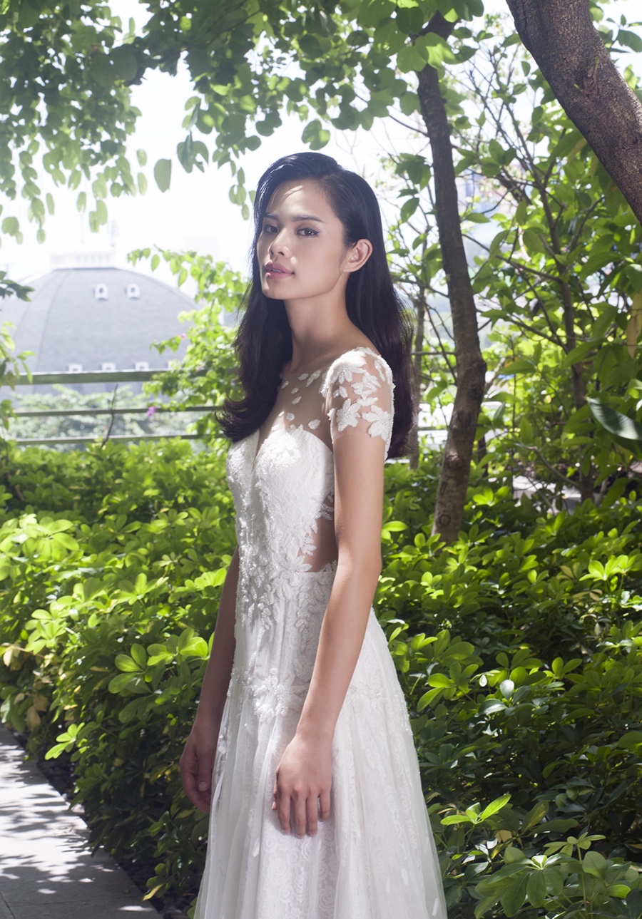 | Trần Thu Hiền, người mẫu trưởng thành từ cuộc thi Vietnam's Next Top Model đảm nhận vai trò mẫu chính thể hiện bộ sưu tập áo cưới mùa hạ lãng mạn. BST có tông màu trắng chủ đạo. Chất liệu ren kết hợp tinh tế cùng voan, tạo những khoảng hở quyến rũ cho các cô dâu gợi cảm. |