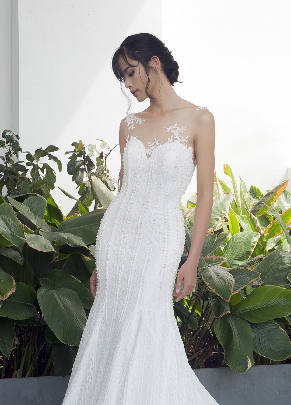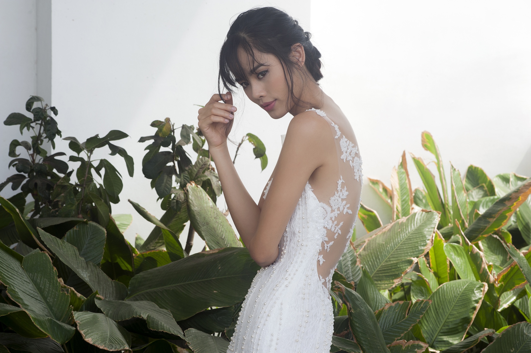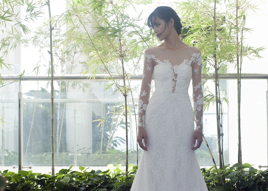 | Trần Thu Hiền, người mẫu trưởng thành từ cuộc thi Vietnam's Next Top Model đảm nhận vai trò mẫu chính thể hiện bộ sưu tập áo cưới mùa hạ lãng mạn. BST có tông màu trắng chủ đạo. Chất liệu ren kết hợp tinh tế cùng voan, tạo những khoảng hở quyến rũ cho các cô dâu gợi cảm. |
