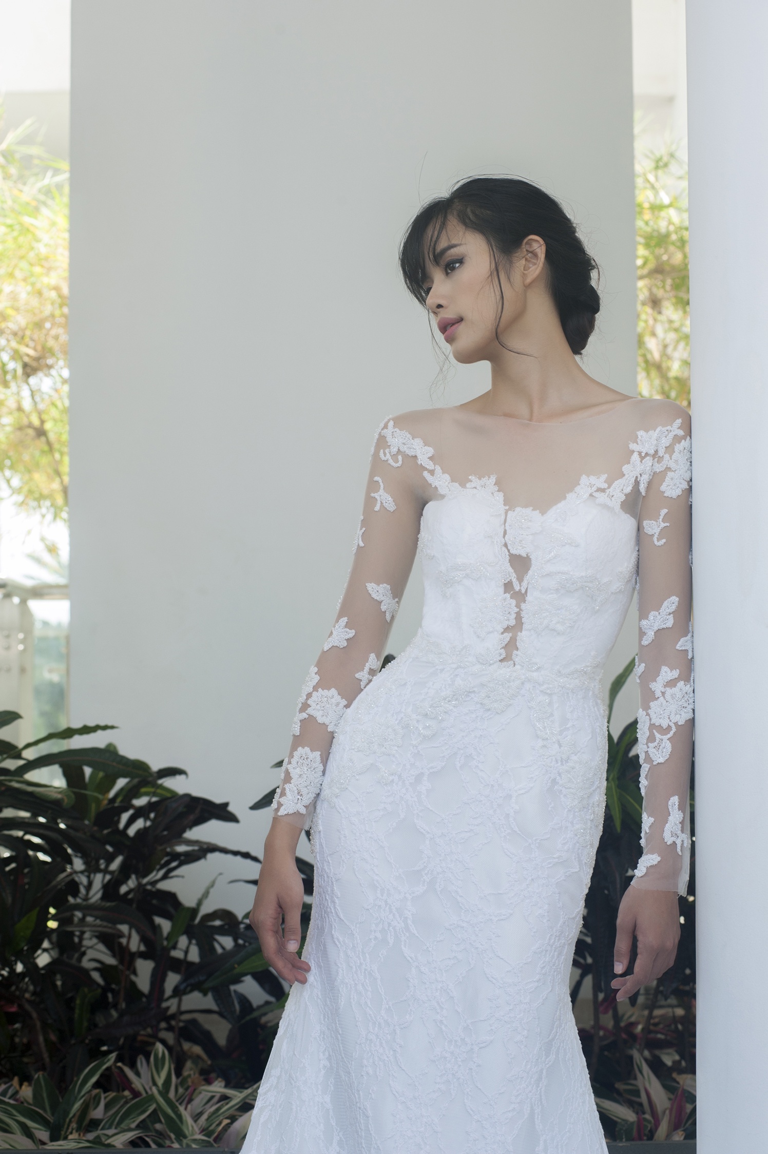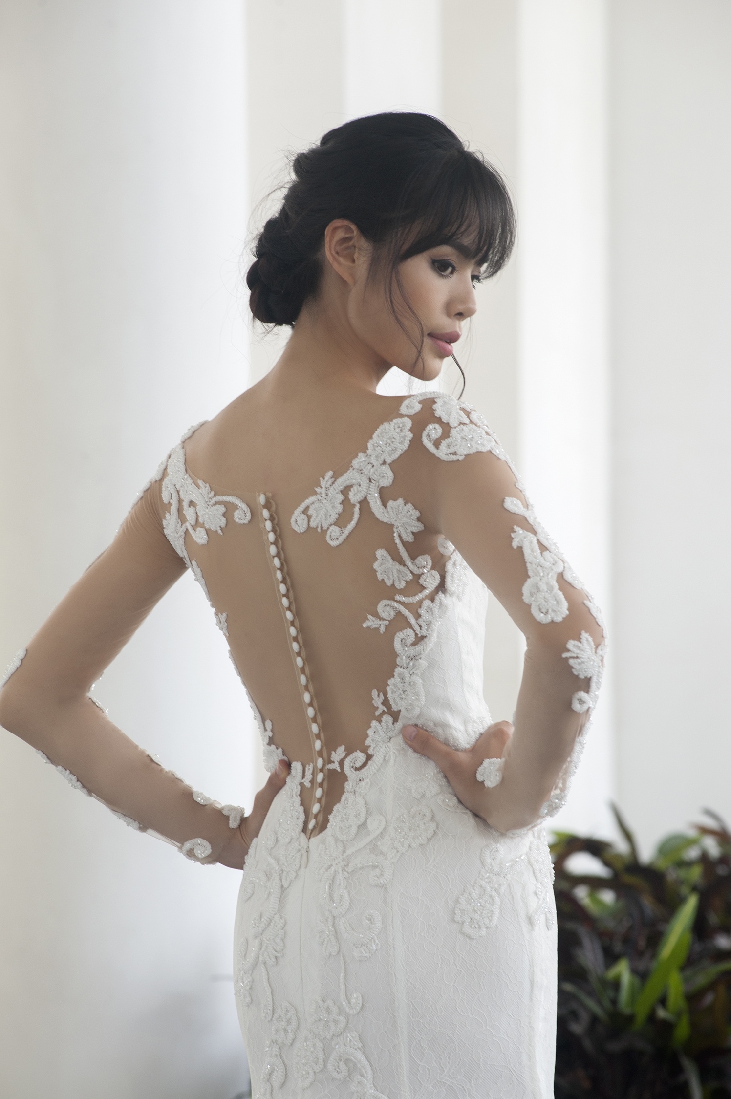 | Với cách xử lý theo xu hướng xuyên thấu, chiếc áo cưới mùa đã hòa quyện cùng những đường cong của người mặc. Thu Hiền được trang điểm chỉn chu bởi chuyên gia Dũng Phan. |