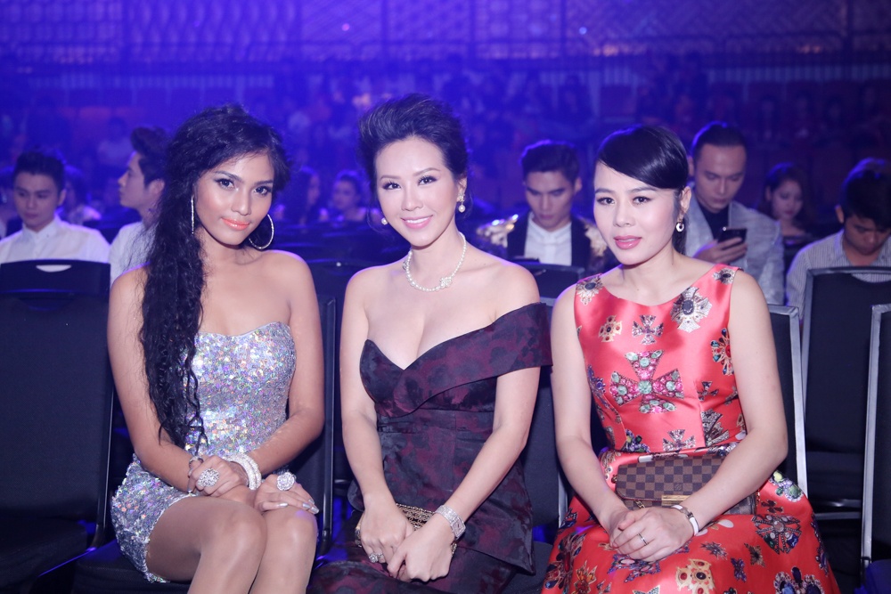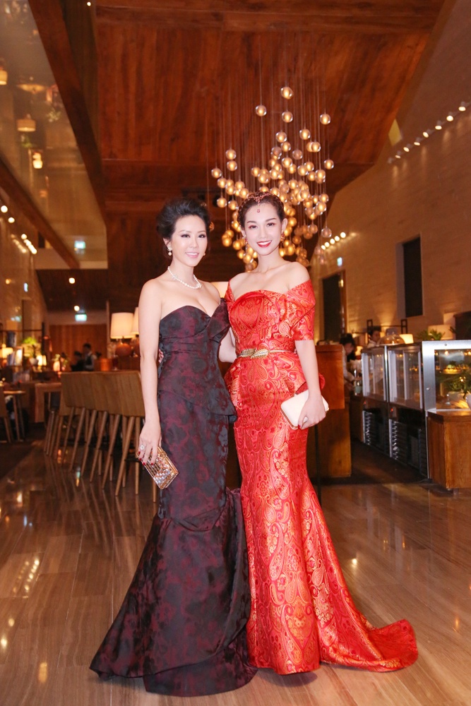 | Diện trang phục yêu kiều, hoa hậu tự tin tạo dáng cùng MC Quỳnh Chi. Bà mẹ một con chọn trang phục dạ hội họa tiết gấm, nổi bật không kém cạnh người đẹp U40. |