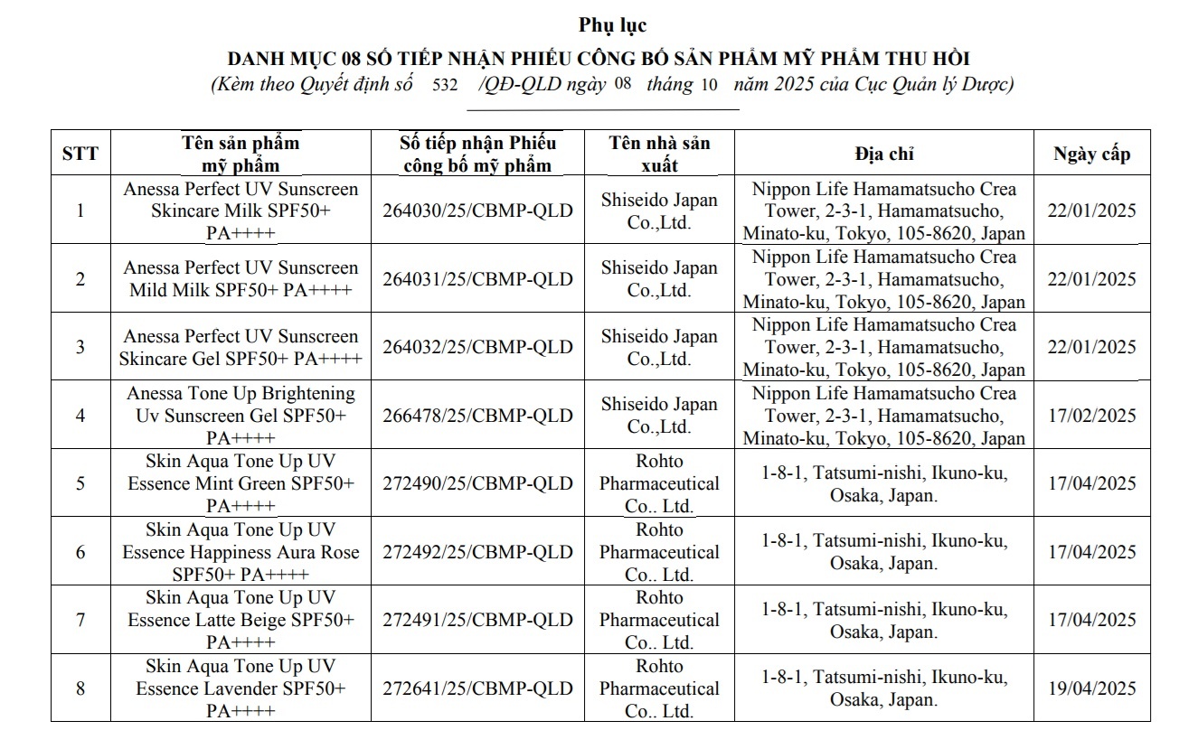 Những sản phẩm này được sản xuất bởi hai thương hiệu lớn của Nhật Bản là Shiseido Japan Co., Ltd. và Rohto Pharmaceutical Co., Ltd., được Cục Quản lý Dược cấp số tiếp nhận trong khoảng thời gian từ tháng 1 đến tháng 4/2025.