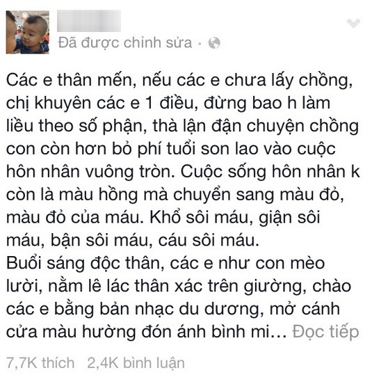 "Các em thân mến, nếu các em chưa lấy chồng, chị khuyên các em một điều, đừng bao giờ làm liều theo số phận, thà lận đận chuyện chồng con còn hơn bỏ phí tuổi son lao vào cuộc hôn nhân vuông tròn. Cuộc sống hôn nhân không còn là màu hồng mà chuyển sang màu đỏ, màu đỏ của máu. Khổ sôi máu, giận sôi máu, bận sôi máu, cáu sôi máu".