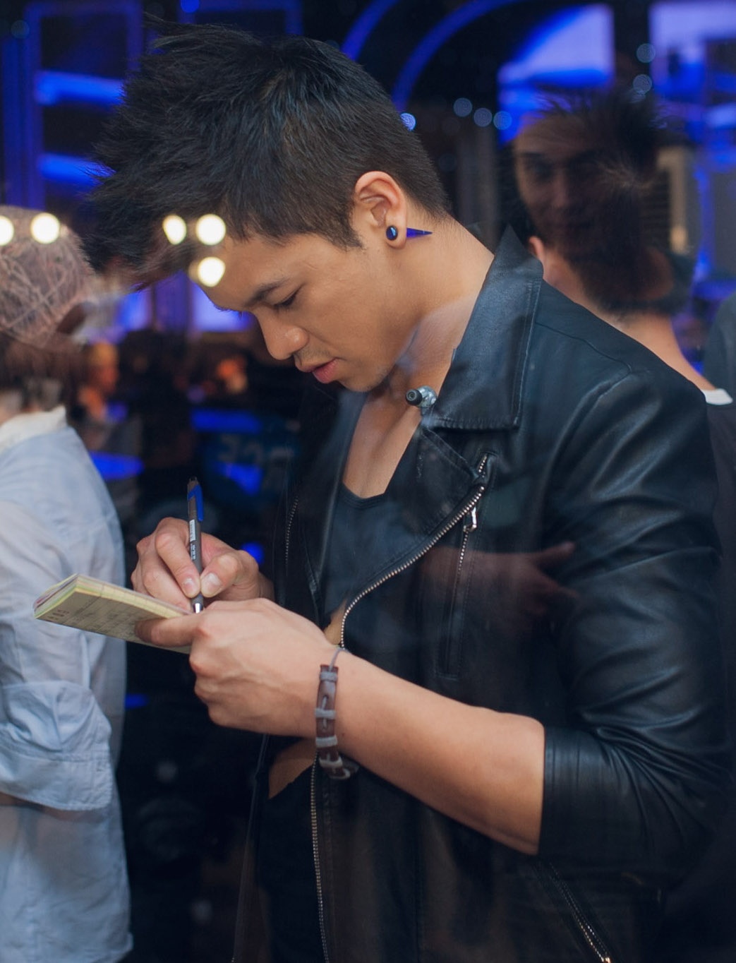 | Chàng Việt kiều Trọng Hiếu tranh thủ ký tặng cho fan. Trước đó, anh được divo Tùng Dương dành cho nhiều lời có cánh: "Trọng Hiếu là thí sinh để lại cho tôi nhiều ấn tượng nhất. Cậu ấy không chỉ có ngoại hình bắt mắt mà còn rất chuyên nghiệp và thành thạo trong việc giải phóng hình thể. Bên cạnh đó, anh chàng chọn bài hát rất cập nhật, gần với thị hiếu của giới trẻ”. |