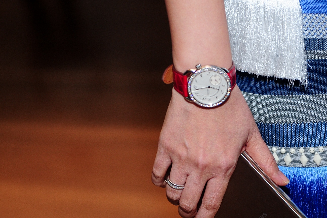 | Đồng hồ Hermes dây da đắt đỏ làm điểm nhấn cho tổng thể. |