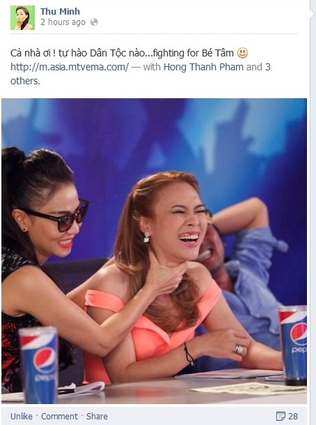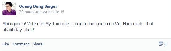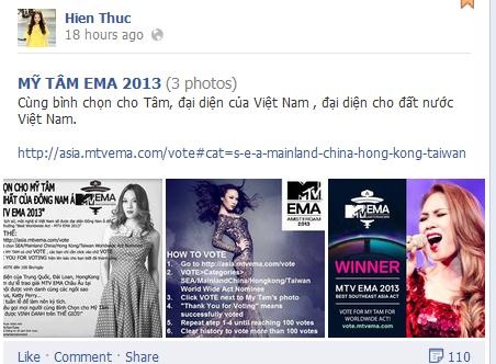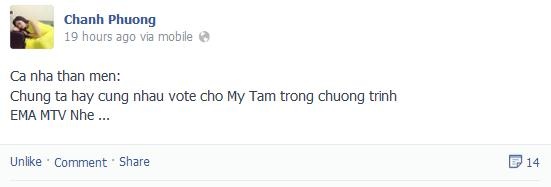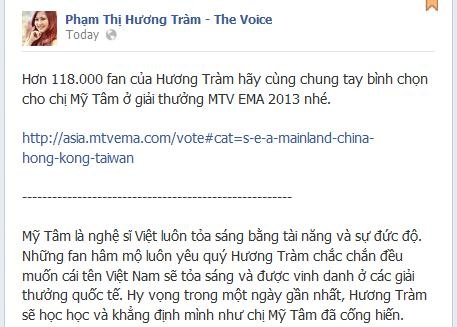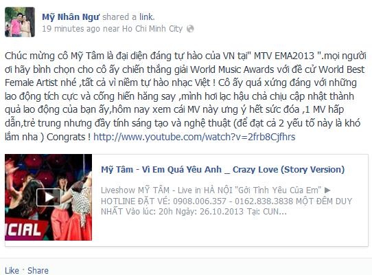 Trong khi các fan của Mỹ Tâm đang tích cực bình chọn, thì các ca sĩ khác cũng đã lên tiếng kêu gọi các fan của mình. Thu Minh đăng lời kêu gọi ủng hộ "bé Tâm" kèm theo hình ảnh minh họa rất đáng yêu của cả hai khi cùng ngồi ghế nóng Vietnam Idol 2013 (Thu Minh là giám khảo khách mời).