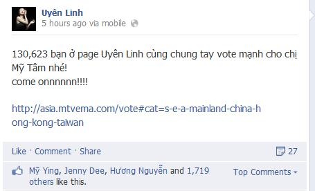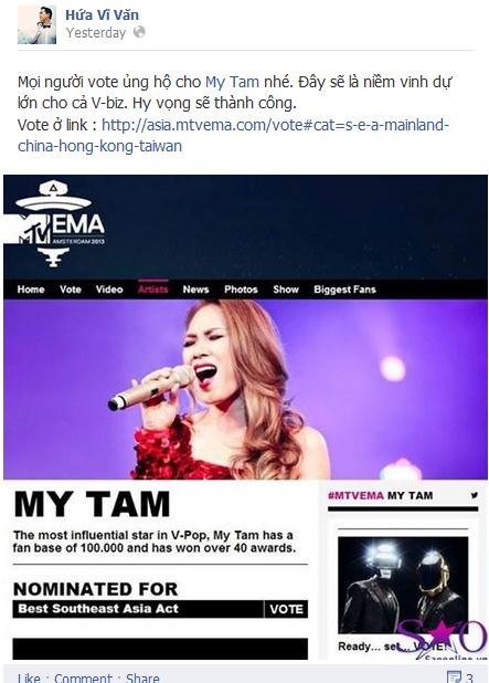 Nhiều sao Việt đã lên tiếng kêu gọi người hâm mộ chung tay bình chọn cho Mỹ Tâm vượt qua 2 đối thủ đế từ Đại lục Trung Quốc/Hong Kong và Đài Loan.