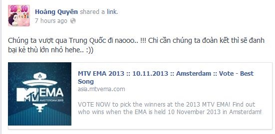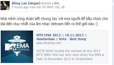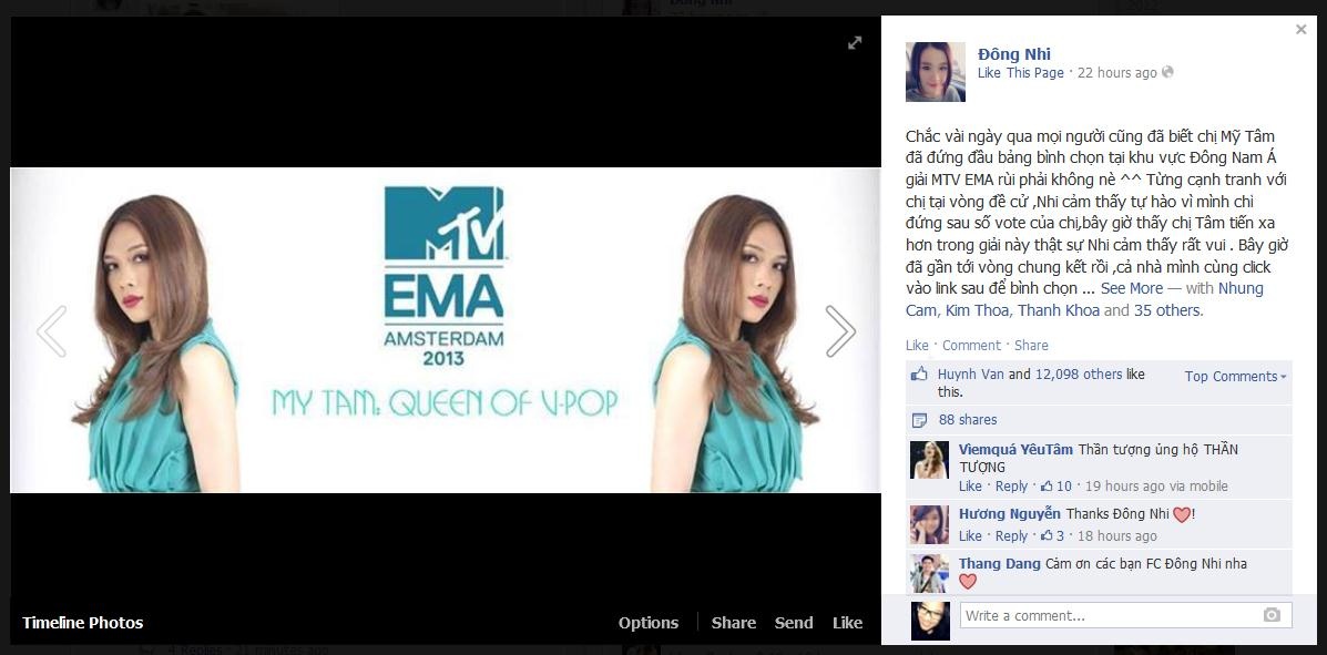 | Đông Nhi là người đứng thứ nhì trong cuộc chạy đua trở thành đại diện của Việt Nam tham gia MTV EMA. Dù vậy, với cô ca sĩ trẻ này, đây đã là một vinh dự. Đông Nhi viết: "Từng cạnh tranh với chị tại vòng đề cử, Nhi cảm thấy tự hào vì mình chỉ đứng sau số vote của chị. Bây giờ thấy chị Tâm tiến xa hơn trong giải này thật sự Nhi cảm thấy rất vui . Bây giờ đã gần tới vòng chung kết rồi, cả nhà mình cùng click vào link sau để bình chọn cho chị Tâm nhé". |