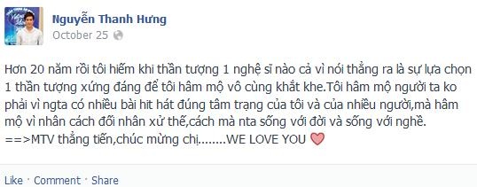 Quán quân The Voice 2012 chia sẻ: "Mỹ Tâm là nghệ sĩ Việt luôn tỏa sáng bằng tài năng và sự đức độ. Những fan hâm mộ luôn yêu quý Hương Tràm chắc chắn đều muốn cái tên Việt Nam sẽ tỏa sáng và được vinh danh ở các giải thưởng quốc tế. Hy vọng trong một ngày gần nhất, Hương Tràm sẽ học học và khẳng định mình như chị Mỹ Tâm đã cống hiến".
