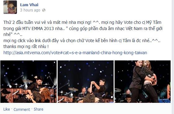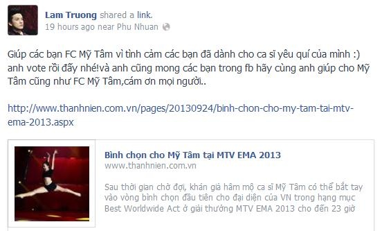 "Anh Hai" Lam Trường không ngần ngại thú nhận mình cũng đã bình chọn cho Mỹ Tâm. Anh cũng nhờ các fan của mình hãy đồng lòng để giúp cho Mỹ Tâm và FC của cô.
