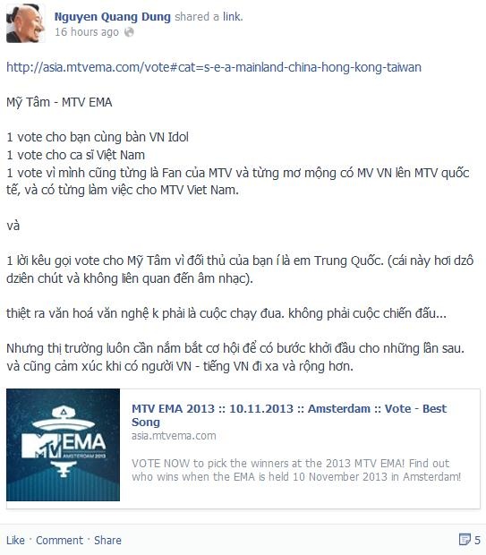 | Đạo diễn Nguyễn Quang Dũng rất thân thiết với Mỹ Tâm kể từ khi cả hai cùng ngồi ghế nóng Vietnam Idol 2012. Anh viết: "Một vote cho bạn cùng bàn VN Idol. Một vote cho ca sĩ Việt Nam. Một vote vì mình cũng từng là fan của MTV và từng mơ mộng có MV VN lên MTV quốc tế, và có từng làm việc cho MTV Vietnam". |