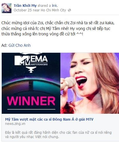 Khởi My không ít lần chia sẻ mình là một fan của Mỹ Tâm, nên chắc chắn cô không quên ủng hộ thần tượng của mình.