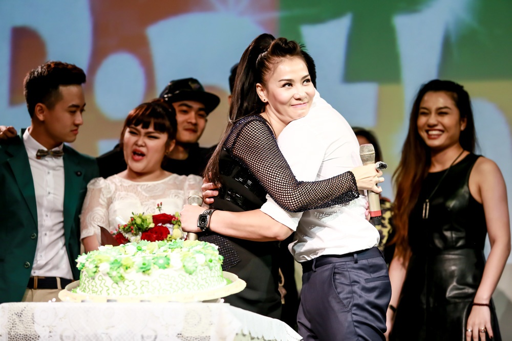 | Để cảm ơn, Thu Minh lần lượt ôm hôn từng học trò khi họ lên biểu diễn. Trúc Nhân vốn rất thân thiết với nữ ca sĩ nên có mặt từ khá sớm. |