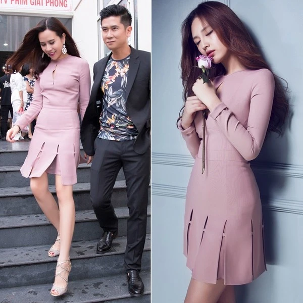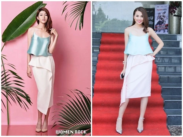 | Phùng Khánh Linh đụng thiết kế với người mẫu Lệ Hằng. Chân dài làng mốt Việt diện khi tản bộ trên phố Sài thành, còn nữ ca sĩ trẻ ứng dụng trên sân khấu âm nhạc. |