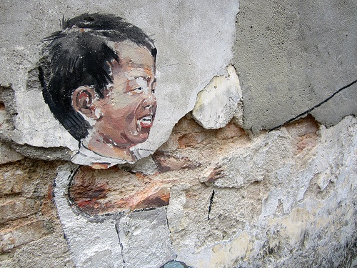 Bức vẽ được thực hiện ngay trên mảng tường vôi nham nhở.