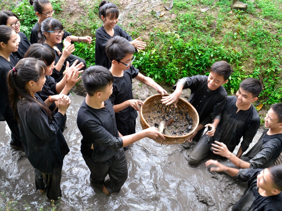 | Giới trẻ thích thú thành nông dân trong trò chơi be mương tát cá. Ảnh: Vinh Sang. |