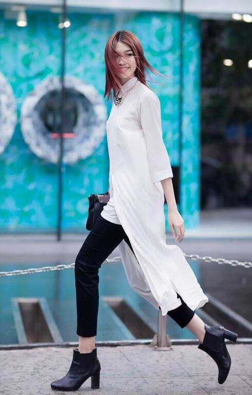 | Người mẫu Quỳnh Châu diện mốt sơ-mi dáng dài tự tin sải bộ trên đường phố trung tâm Sài thành. Tín đồ thời trang khen ngợi chân dài phối màu trắng đen ăn ý. |