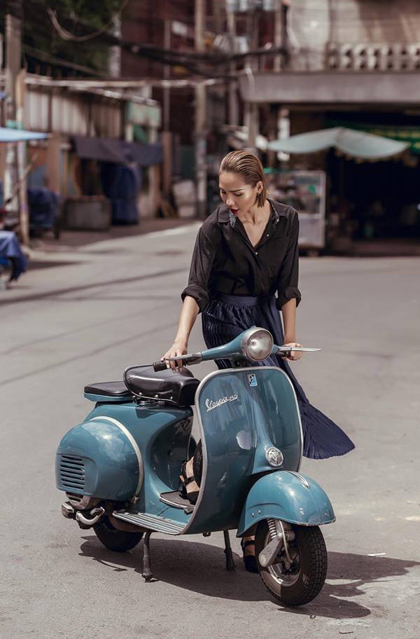 | Minh Triệu dạo phố cùng chiếc vespa cổ. Cô diện áo sơ-mi đen kết hợp chân váy xếp ly màu xanh dương nữ tính. Cách phối màu trầm phù hợp nước da ngăm gợi cảm của chân dài. |