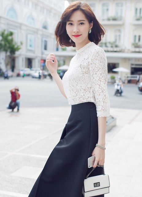 | Xuống phố với phong cách thanh lịch còn có hoa hậu Đặng Thu Thảo. Áo chất liệu ren xuyên thấu lịch thiệp mix ăn ý cùng chân váy midi tối màu và phụ kiện clutch ton sur ton nhã nhặn. Mái tóc bob ngắn giúp hình ảnh người đẹp gốc Bạc Liêu trông mới mẻ và hiện đại. |