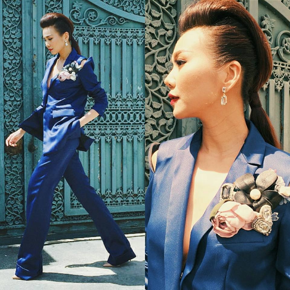 | Thanh Hằng duy trì hình tượng thời trang cá tính khi xuống phố cùng suits màu xanh cobalt. Thiết kế cổ chữ V sâu được nhấn nhá phụ kiện hoa nữ tính. Kiểu tóc "đuôi ngựa" mái bồng phù hợp hình ảnh tomboy mạnh mẽ. |