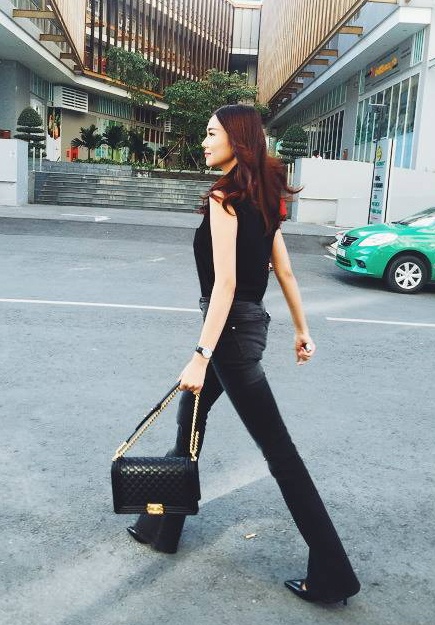 | Một ngày khác, siêu mẫu khoe chân thon dài trong set trang phục quần jeans ống loe và áo thun tối màu đơn giản. |