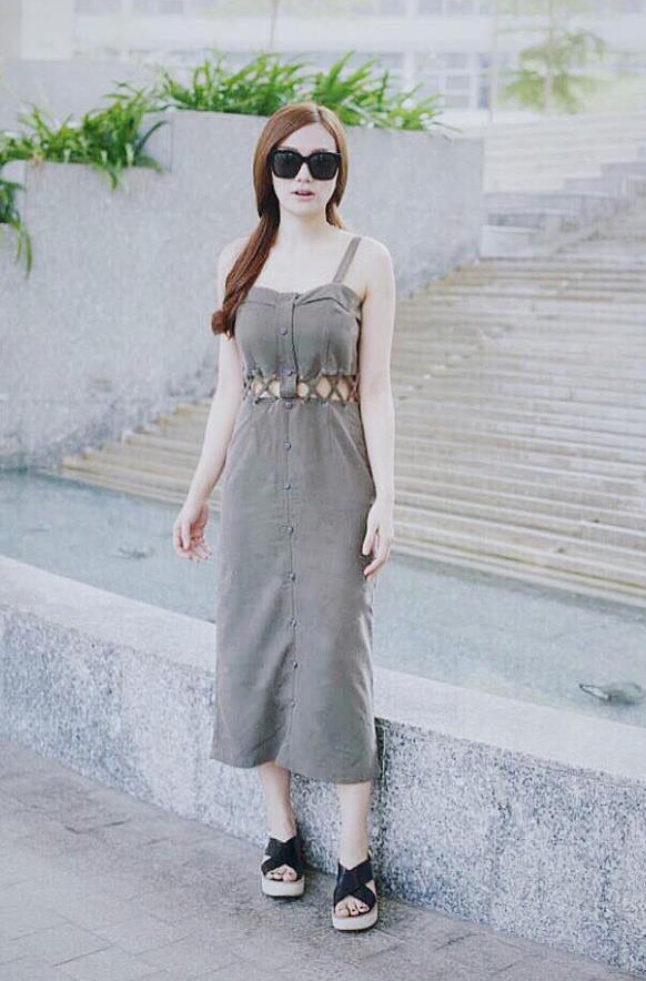 | Bà mẹ một con Thu Thủy diện đầm cài cúc trước nữ tính khi xuống phố. |