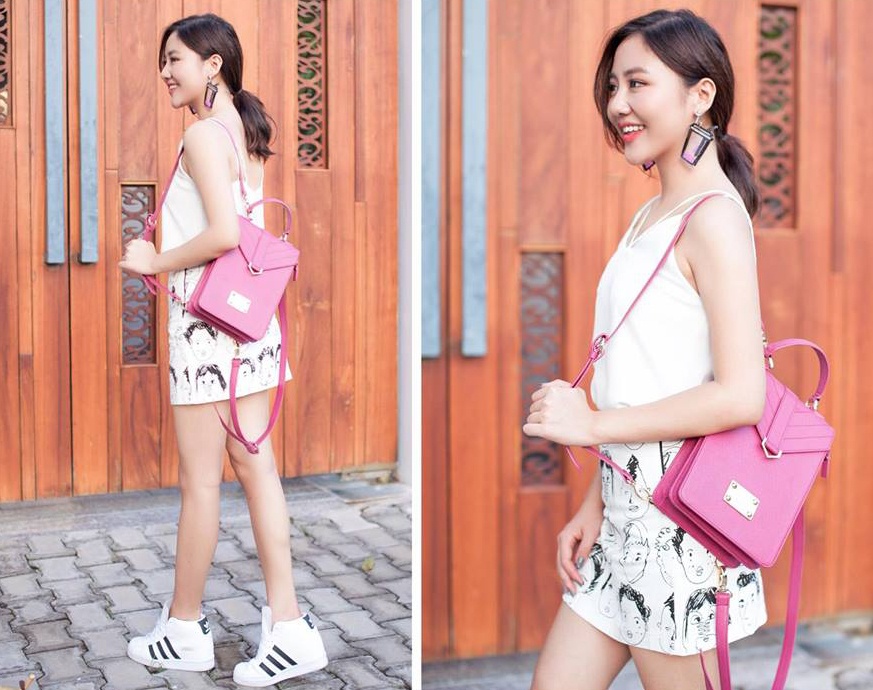| Phong cách đời thường của Văn Mai Hương được khen ngợi trong thời gian qua. Bộ cánh áo hai dây và chân váy in họa tiết mix phá cách cùng giày thể thao, balo tông màu hồng ngọt ngào làm điểm nhấn tổng thể. |
