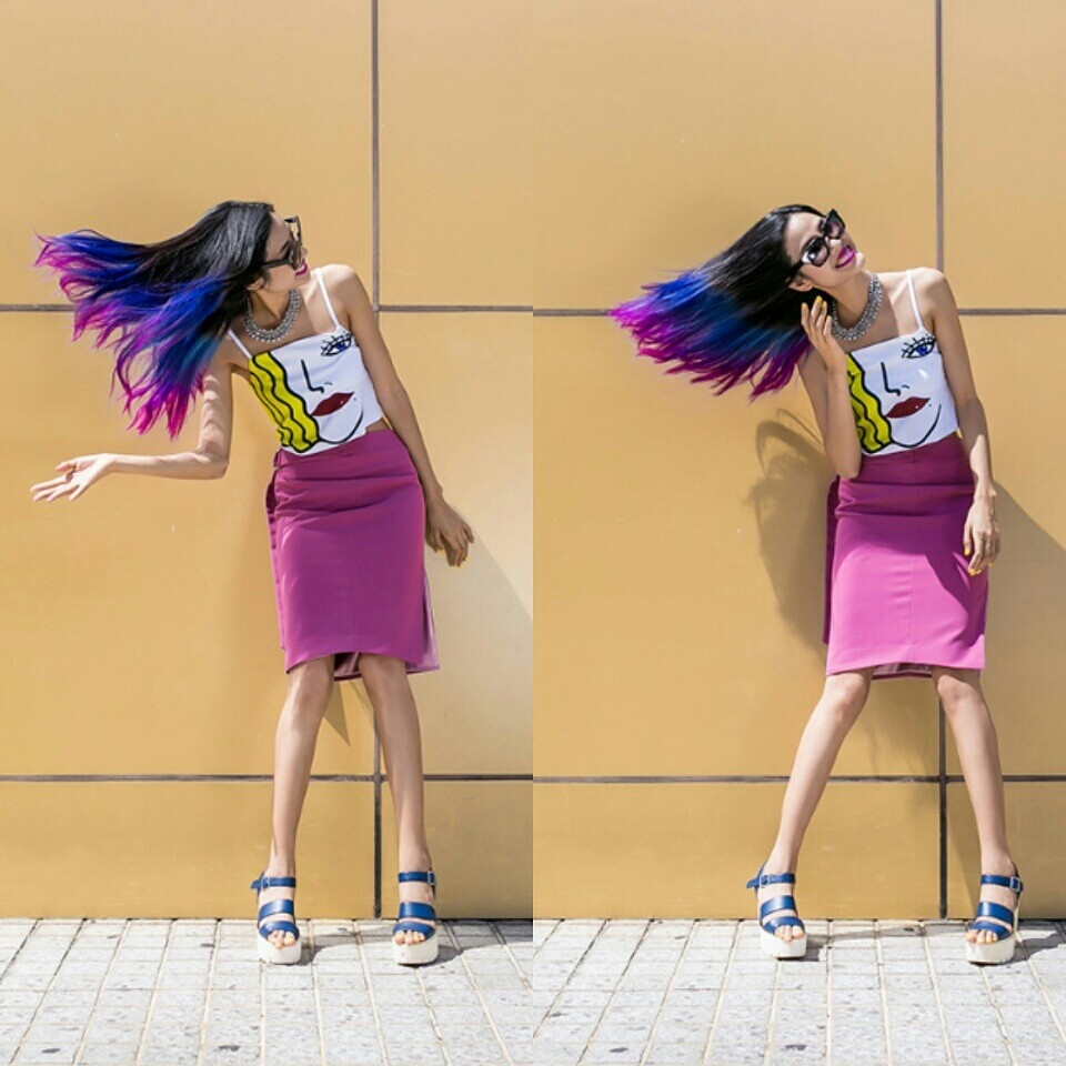 | Hoàng Thùy khoe mái tóc nhuộm màu loang độc đáo khi tản bộ trên phố cuối tuần. Trang phục sắc màu tươi trẻ phù hợp hình ảnh năng động, hiện đại quán quân Vietnam's Next top Model đang hướng đến. Cô không quên đi giày cao tôn vóc dáng mảnh mai. |