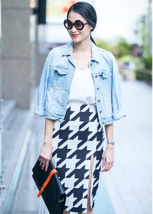 | Thanh Trúc cũng làm bạn với váy bút chì họa tiết răng ngựa. |