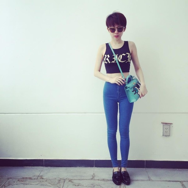 | 6. Quần jeans cạp cao: Thủ thuật của Tóc Tiên giúp cô nối chân dài hơn, tạo vòng eo thon nhỏ với quần cạp cao. |
