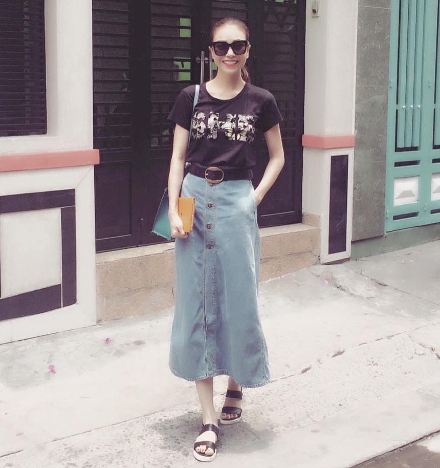 | Phương Trinh khéo léo chọn thắt lưng đen là điểm nhấn để tạo vòng eo gọn gàng hơn. |
