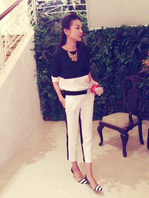 | Đây cũng là lựa chọn khéo léo của Thanh Hằng với mốt quần trắng nẹp đen. |