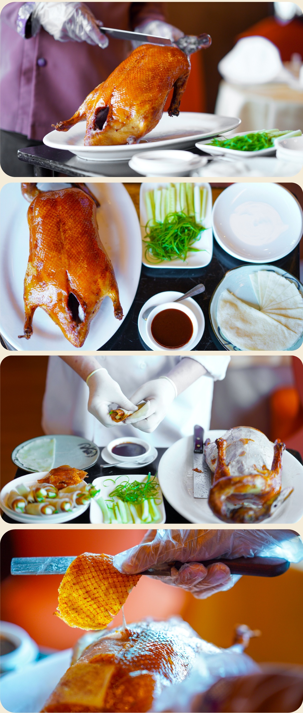 Nhân viên đưa tôi đến chiếc bàn đã đặt từ trước, nằm ngay cửa sổ, nhìn xuống vòng xoay ngã năm tấp nập phía dưới. Ở đây, tôi chiêm ngưỡng màn "biểu diễn" cắt da vịt quay Bắc Kinh vốn nổi tiếng trong cộng đồng ẩm thực Trung Hoa.
