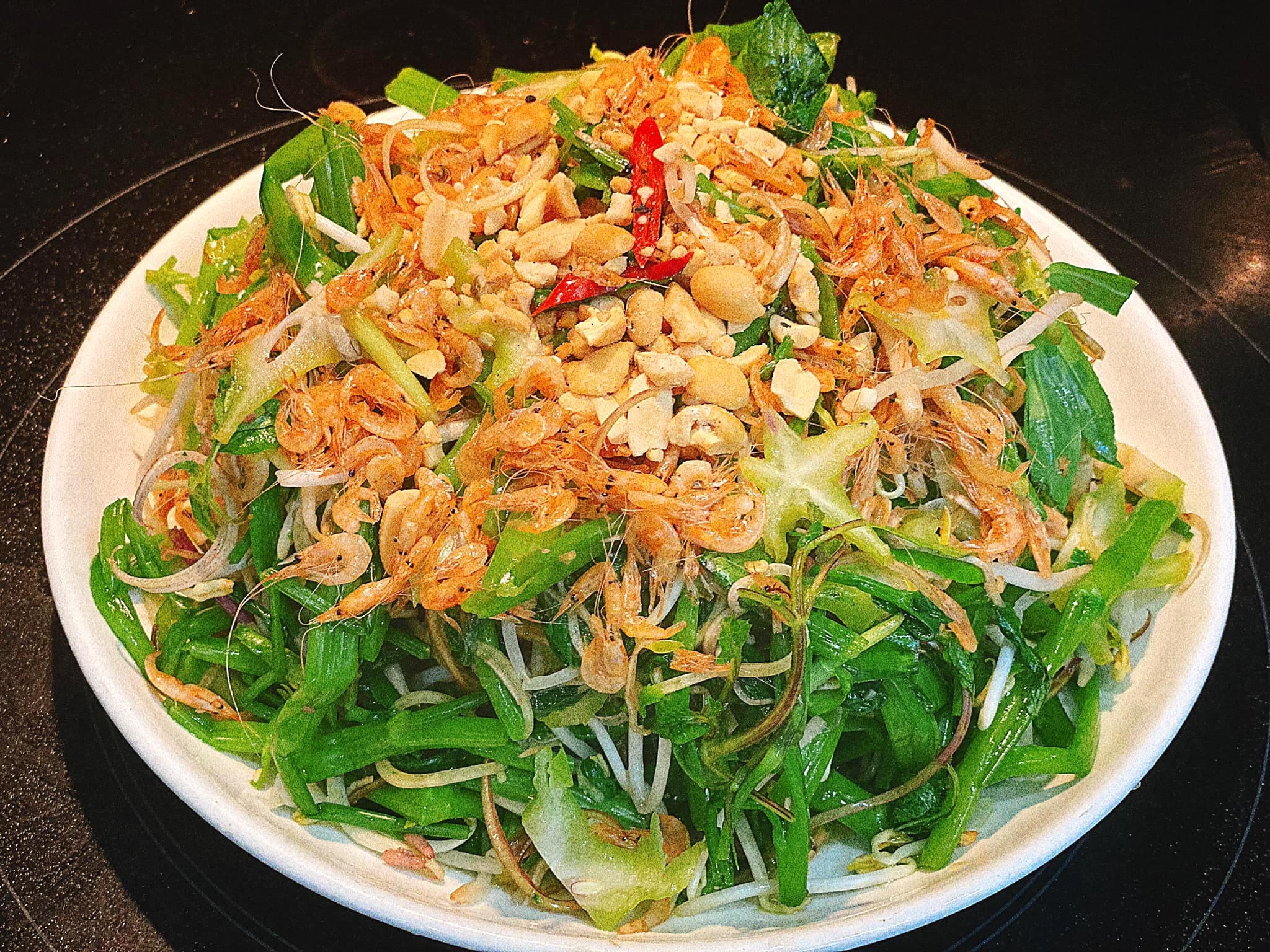 - Canh sấu rau rút, ba chỉ chiên sả, đậu hũ non sốt thịt bằm, đậu bắp luộc, sấu ngâm mắm