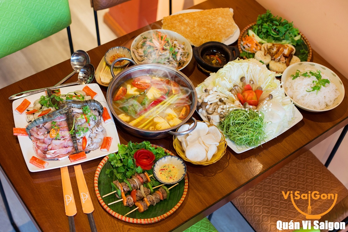 | Lẩu hải sản là một trong các món lẩu bán chạy nhất của quán Vi Sài Gòn. Món ăn này ghi điểm bởi các loại hải sản tôm, ngao, cá, bạch tuộc… đều rất tươi. Khi nhân viên quán bưng đồ ăn lên, nếu bạn thấy có một, hai con tôm nhảy tanh tách ra khỏi đĩa thì cũng là chuyện bình thường bởi lẽ trước đó ít phút, chúng vẫn còn đang bơi lội trong bể nước. Ngoài ra, nước lẩu ở đây còn rất ấn tượng bởi hương vị chua cay ngọt nhẹ và thơm lừng mùi húng quế độc đáo. |